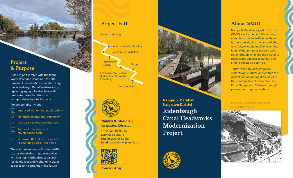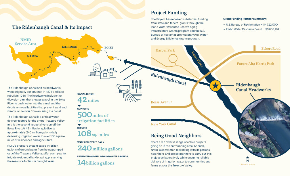After 120 years of successfully delivering water to landowners across the Treasure Valley, the district is starting a project to replace the Ridenbaugh Headworks. The Headworks allows water to be diverted out of the Boise River into the Ridenbaugh Canal for delivery to landowners. This project will improve worker and public safety, increase operational efficiency, reduce operational water loss, and increase flexibility to respond to changing Boise River flows. Most importantly, NMID wants to ensure we can deliver water to landowners for the next 120+ years.